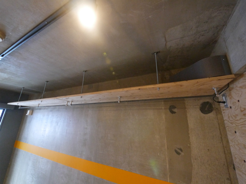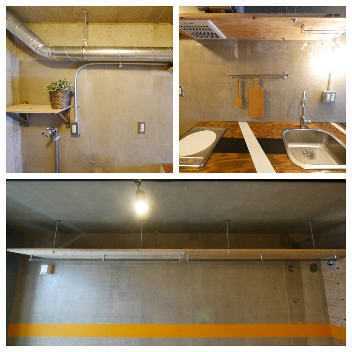 洗濯機置場の上に棚。キッチンには食器などを掛けられるバー。収納の上には物置き。