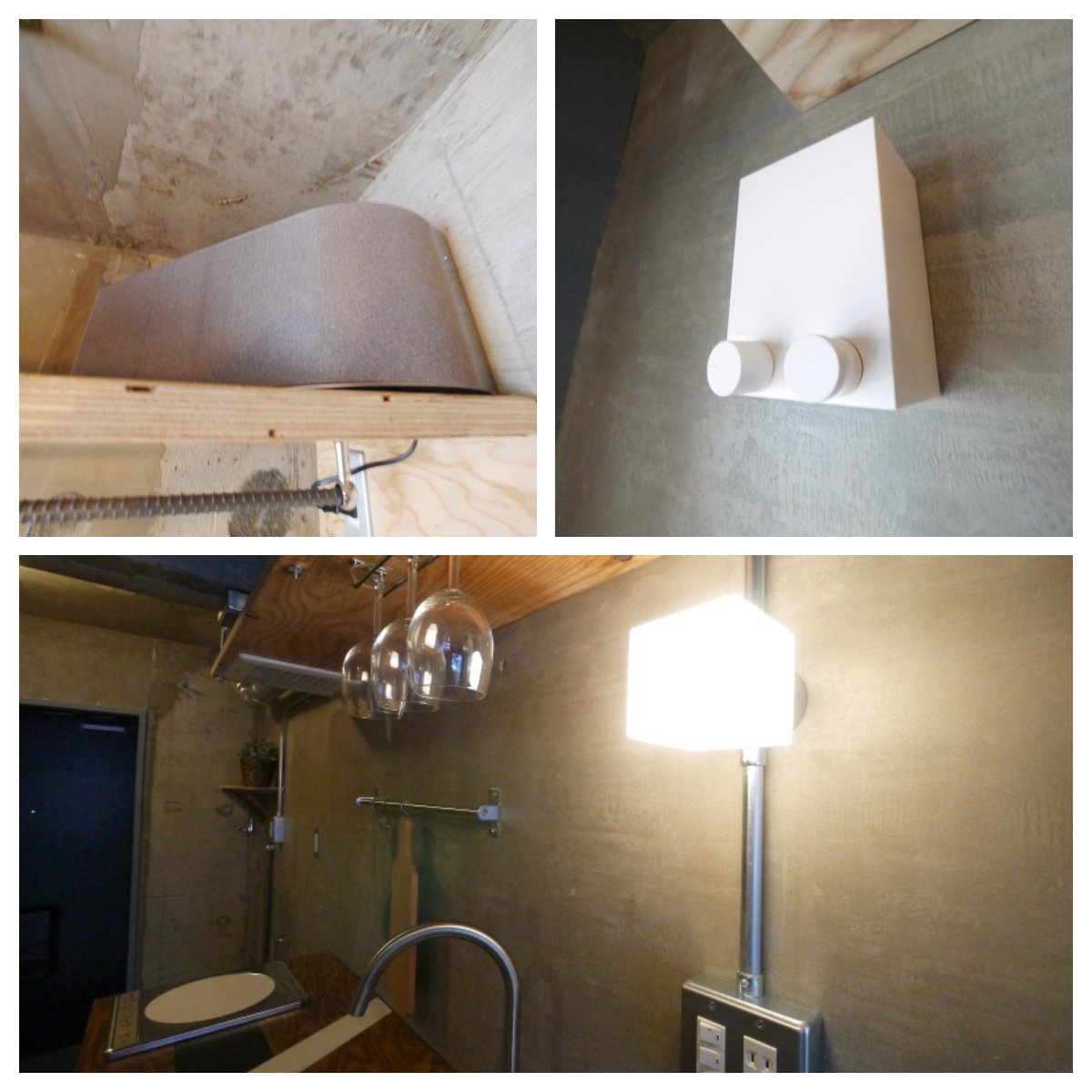 下はグラスハンガー、ブラケットライト。カウンターキッチンを楽しめるようになっています。