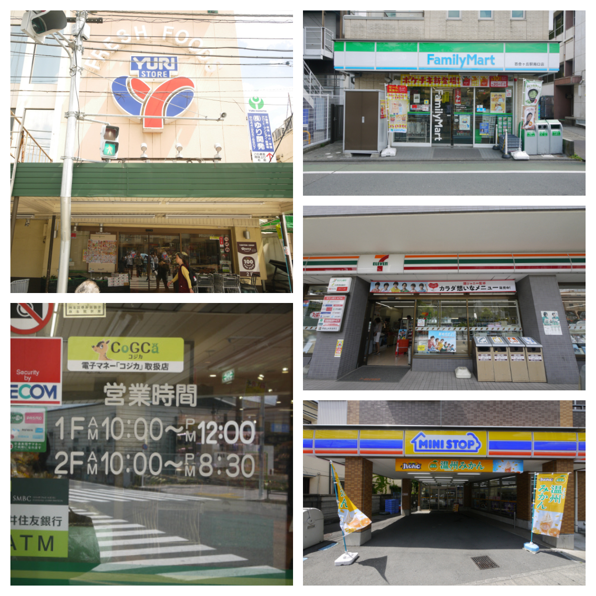 南口を出てすぐに地域密着のスーパーマーケット【ゆりストア百合ヶ丘本店】があります。営業時間は1階が10:00~24時まで、2階が10:00~20:30までと遅くまでやってますよ♪南口から物件まではファミリーマート。