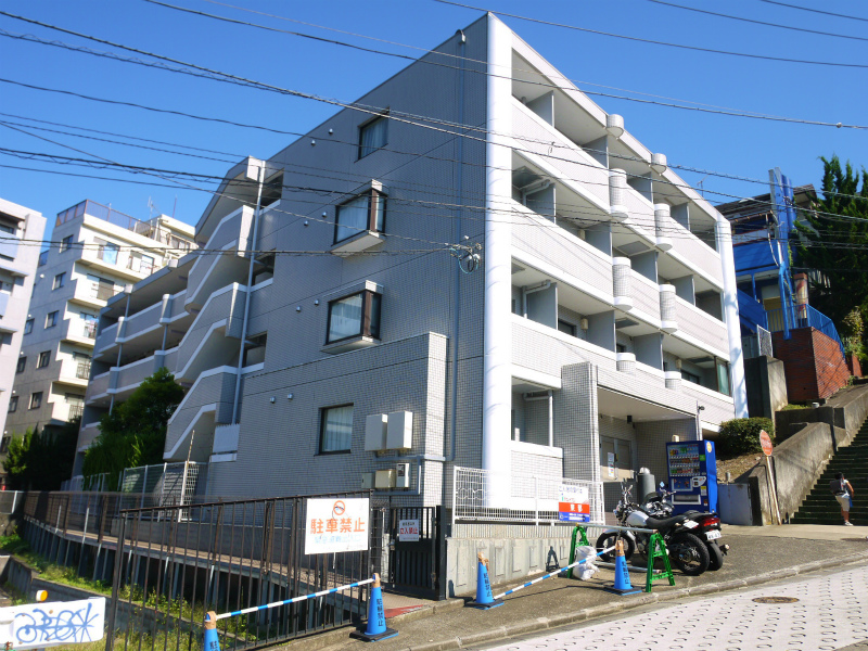 坂の途中に建物があります。坂といっても30秒も歩かず到着します♪奥行がある建物なので周りでは、ひと際目立つマンションです(´∀`○)ノ