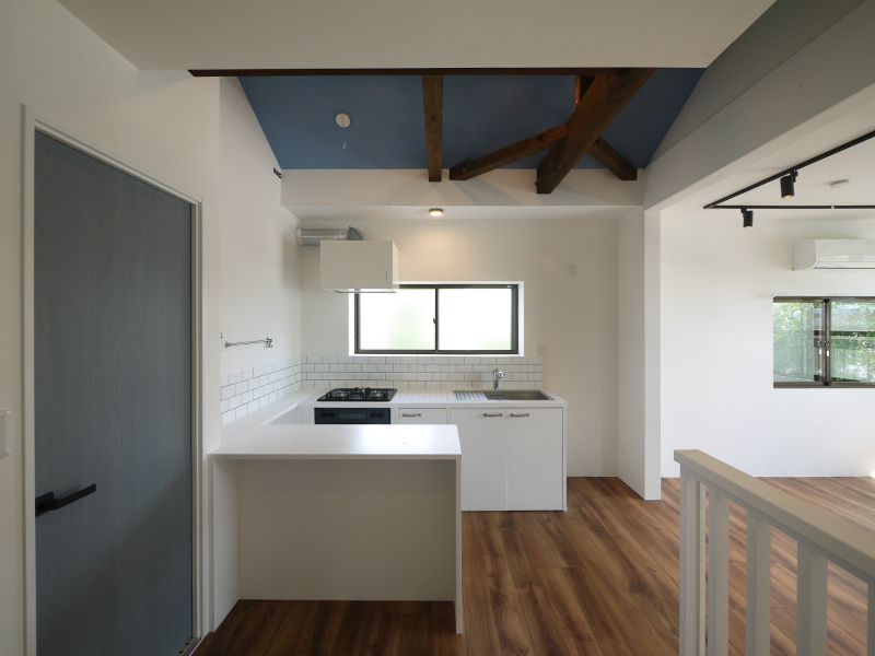 キッチン方向を見るとこの様な感じで、スツールチェアが2脚置けるカウンター(調理スペース)があります。