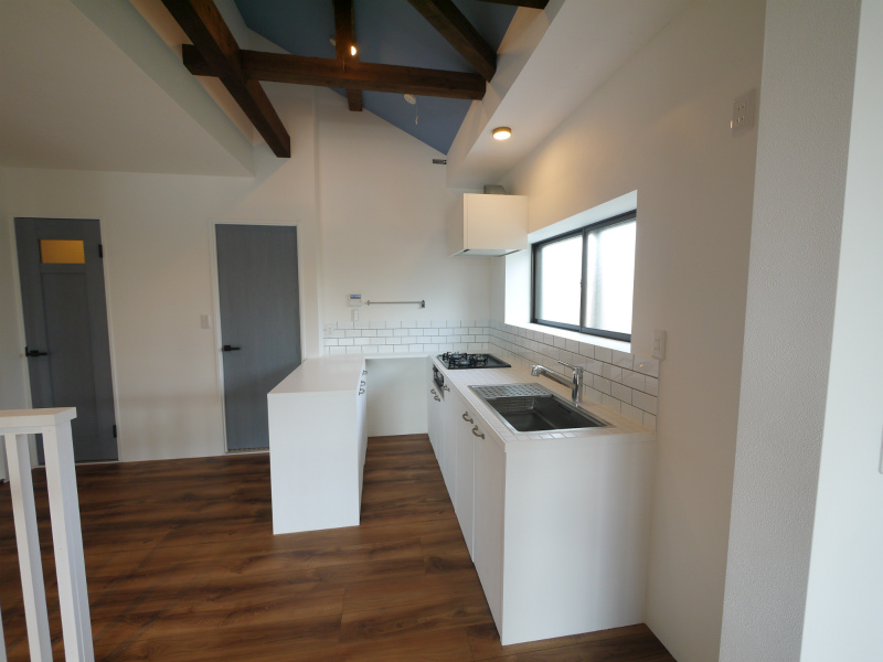 階段を上がるとキッチンがあります。ガスコンロ3口のシステムキッチン、調理スペースは背面にもたっぷりあります。