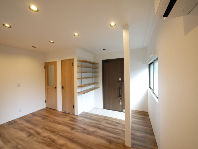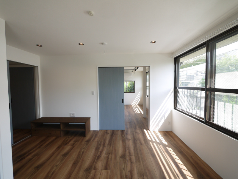 リビングは8.2帖あり、L字型のソファも楽々置けます。各部屋の入り口は淡いグレーに統一されており、清涼感があります♪