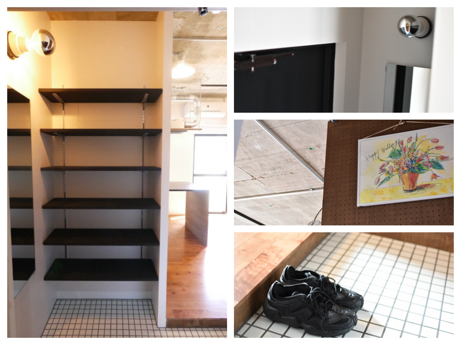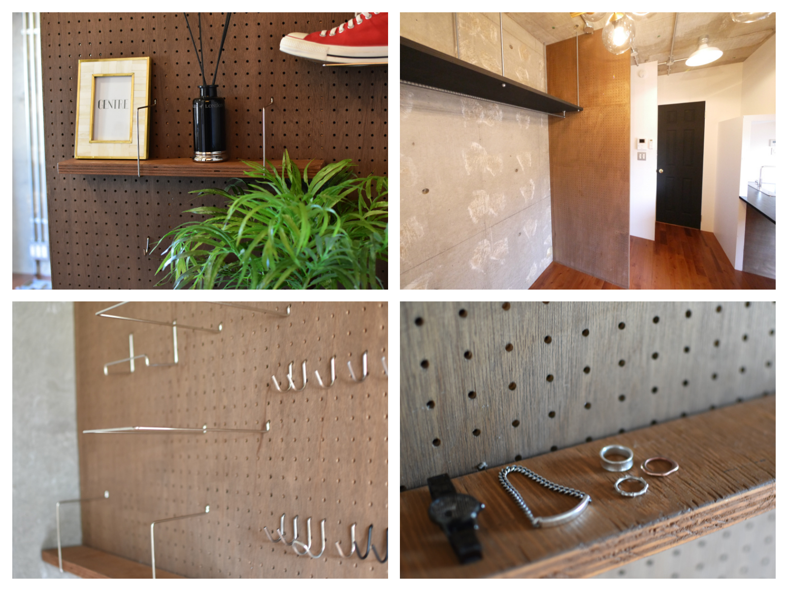 玄関の裏面のお部屋スペースにも有孔ボードがありますので、こちらにはアクセサリーや小物などを置いてみてはいかがでしょうか?