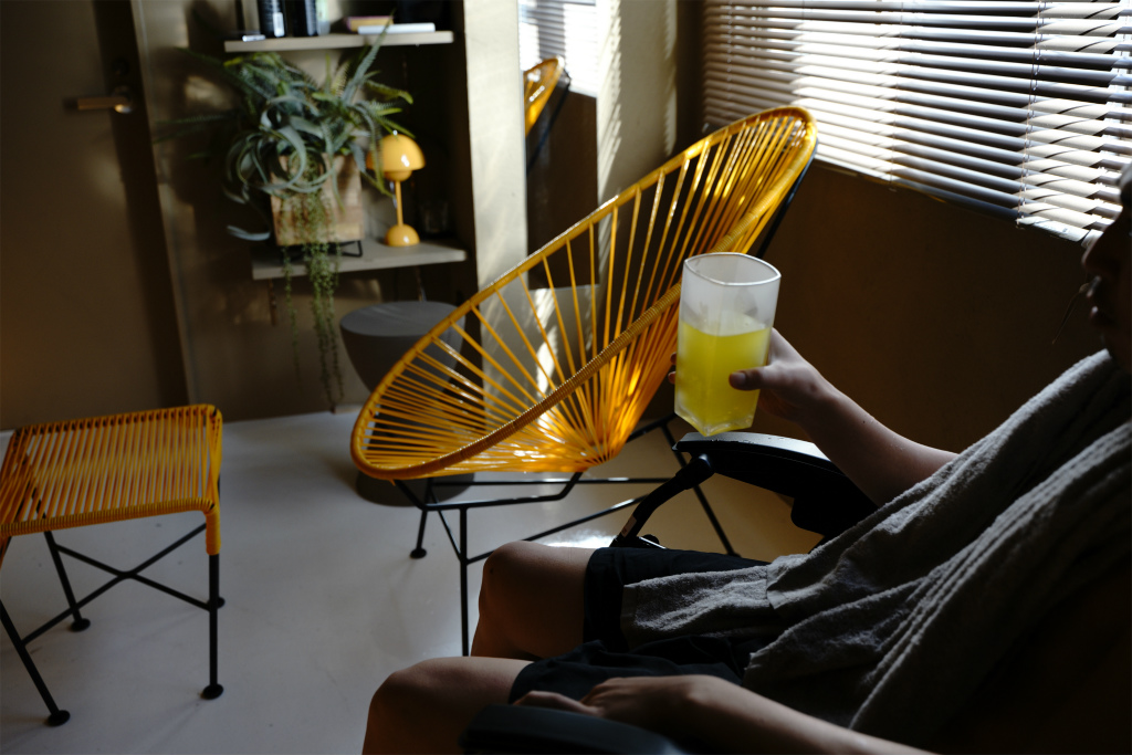 ベランダやテラス、プールサイドなどアウトドアシーンでの使用はもちろん、屋内ではリビングルームやベッドルームでのリラックスチェアとしてお使いいただけます。