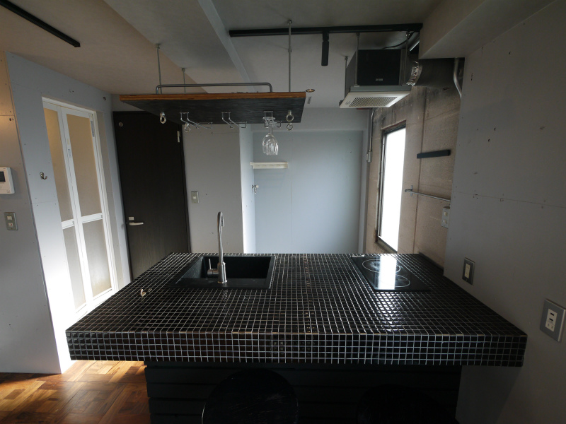 黒いモザイクタイルで造られたオリジナルのキッチン。